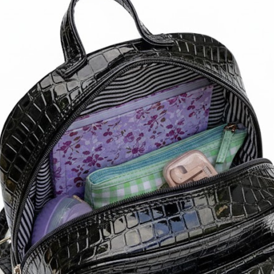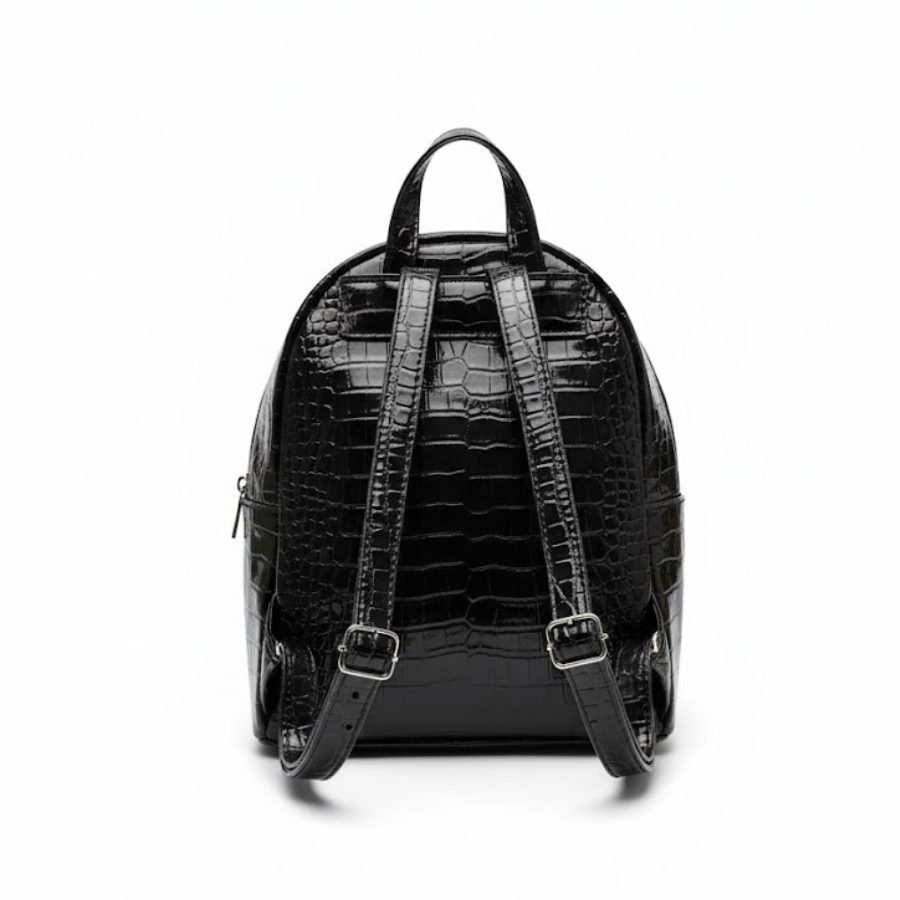 Ideal para quienes desean combinar la funcionalidad de una mochila con la sofisticación de un bolso de alta moda. Su textura "croco" en negro lacado la convierte en el punto focal de cualquier atuendo. Es perfecta para llevar lo esencial de forma segura y organizada, con espacio para tu tablet, billetera y más. Su diseño compacto y sus múltiples bolsillos la hacen versátil para el trabajo, la universidad o salidas urbanas, agregando siempre un toque de glamour.