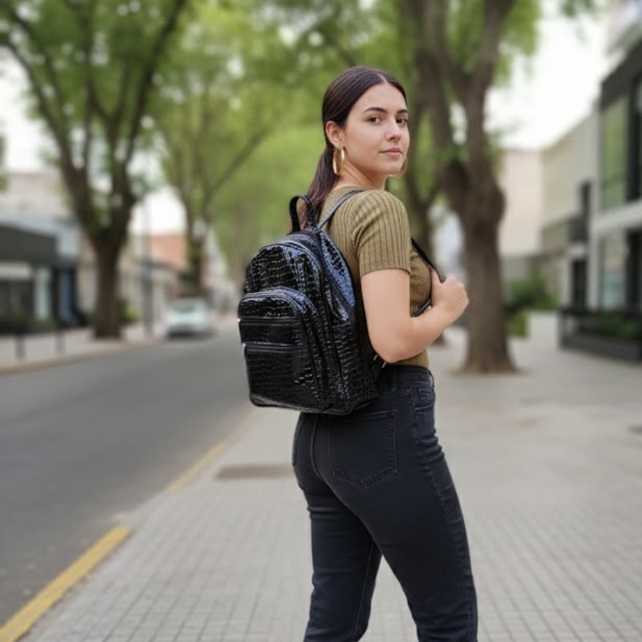 Ideal para quienes desean combinar la funcionalidad de una mochila con la sofisticaci贸n de un bolso de alta moda. Su textura "croco" en negro lacado la convierte en el punto focal de cualquier atuendo. Es perfecta para llevar lo esencial de forma segura y organizada, con espacio para tu tablet, billetera y m谩s. Su dise帽o compacto y sus m煤ltiples bolsillos la hacen vers谩til para el trabajo, la universidad o salidas urbanas, agregando siempre un toque de glamour.