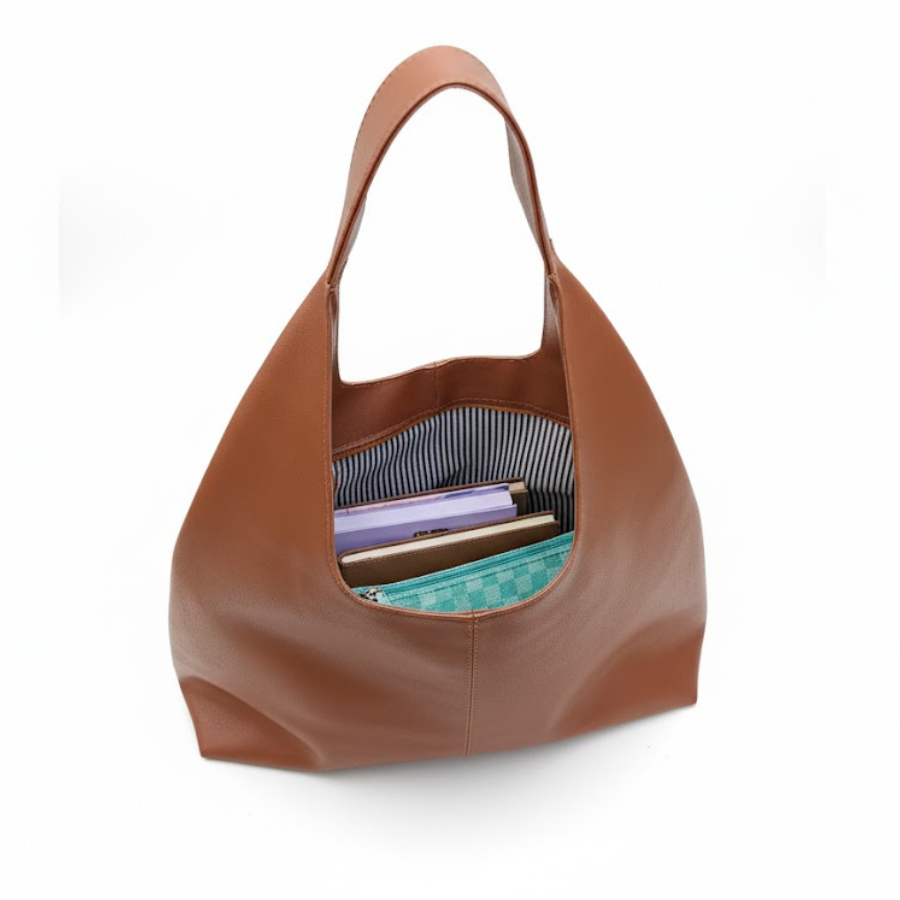 Su diseño de "hobo bag" curvo se adapta perfectamente al contorno del hombro, ofreciendo comodidad durante todo el día. Es ideal para quienes prefieren un estilo sutil pero impactante, ya que el foco está puesto en la calidad del material y la simplicidad de la forma. Su interior es amplio, perfecto para llevar tus esenciales diarios, una botella de agua pequeña o una tablet. El color suela la hace un accesorio perfecto para complementar looks neutros y agregar un toque de calidez.
