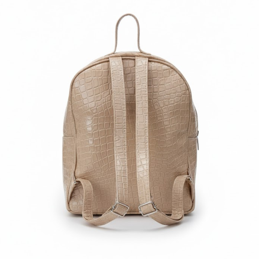La Mochila Sahara ofrece la sofisticación de la textura croco en un tono nude/beige, convirtiéndola en un accesorio elegante y versátil para tu rutina.