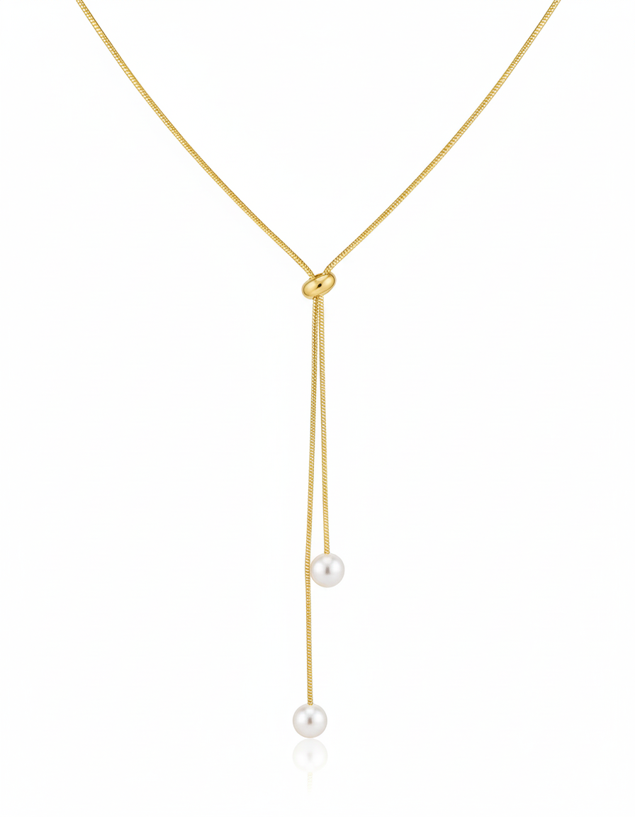 Collar enchapado en oro con diseño tipo lazo ajustable y delicadas perlas en los extremos. Su estilo minimalista y sofisticado lo convierte en el complemento perfecto para cualquier ocasión, aportando un toque de elegancia moderna y femenina. Ideal para regalar o realzar tu look diario.